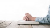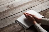 kobieta czytająca Biblię w ciemności na drewnianym stole