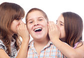 dwa słodkie nastoletnich chłopców plotkować z nastolatka na białym tle