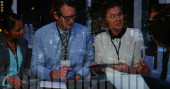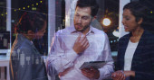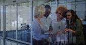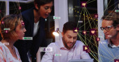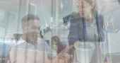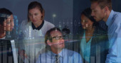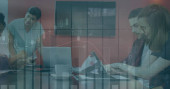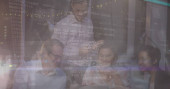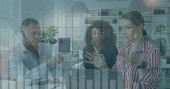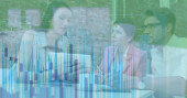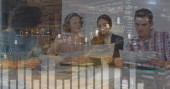 Wizerunek przetwarzania danych nad różnymi ludźmi biznesu mówiącymi. Koncepcja globalnego biznesu i cyfrowego interfejsu generowanego cyfrowo.