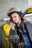 Uśmiechający się pracownik gospodarstwa cyfrowy Tablet w straży pożarnej