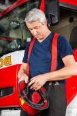 Uśmiechający się strażak siedzi w samochodzie w straży pożarnej