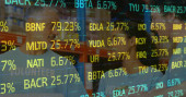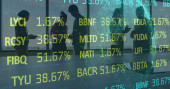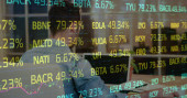 Przeglądanie wykresów analityk w swetrze wpisując na laptopie z podwójnymi monitorami przy biurku, kawie, przestrzeni kopiującej. Technologia, finanse, dane, analityka, przestrzeń robocza, profesjonalny, nowoczesny