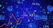 Pływające dane finansowe pokazujące linię, wykresy słupkowe na ekranie, z segmentami ciasta, znacznikami i strzałkami. Analityka, technologia, wizualizacja danych, korporacyjne, nowoczesne, interfejs, cyfrowe