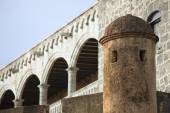 Maria de Toledo statua w Plaza de Espana z Alcazar de Colon (Palacio de Diego jelita grubego). Santo Domingo. Dominikana.