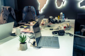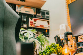 Zdjęcie "Ciepła i przytulna konfiguracja biurka z potrójnymi monitorami, notebookiem, mikrofonem i zielonymi roślinami, stylizowana na minimalistyczną japońską estetykę do kreatywnej pracy." może być wykorzystywane do celów osobistych i komercyjnych zgodnie z warunkami zakupionej licencji Royalty-free. Obraz jest dostępny do pobrania w jakości wysokiej rozdzielczości do 5760x3840.