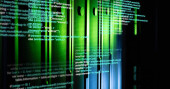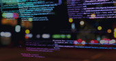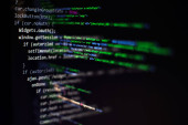 Wyświetlanie wyróżnionego kodu JavaScript na monitorze komputera w ciemnym edytorze, z żółtym kółkiem. Technologia, programowanie, kodowanie, deweloper, oprogramowanie, cyberbezpieczeństwo, cyfrowe
