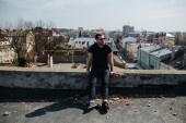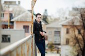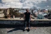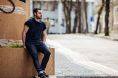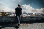 Pewny siebie mężczyzna pozujący w dżinsach selvedge