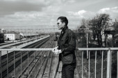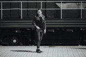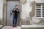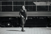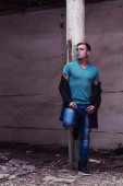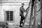Pewny siebie mężczyzna pozujący w dżinsach selvedge