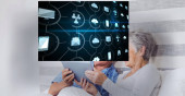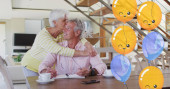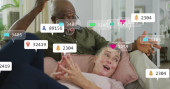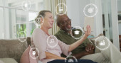 Machanie na tablecie, para seniorów siedząca na kanapie w domu, z choinką i grafiką neuronową. Uroczystość, wspólnota, technologia, uroczystość, ciepło, pamięć, połączenie