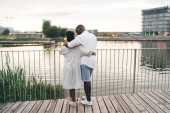 Zdjęcie "Młoda para przytula się czule do wody, ciesząc się razem ciepłem słonecznego dnia.." może być wykorzystywane do celów osobistych i komercyjnych zgodnie z warunkami zakupionej licencji Royalty-free. Obraz jest dostępny do pobrania w jakości wysokiej rozdzielczości do 5760x3840.