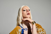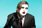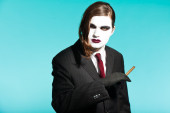 Młody człowiek przebrany za Jokera wyraża radość i kreatywność podczas obchodów Halloween.