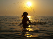 Młode kobiety nago pozowanie na zachód słońca - nimfa