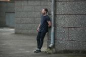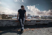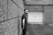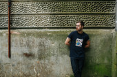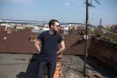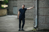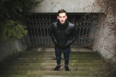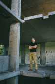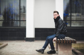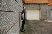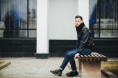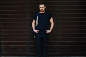 Pewny siebie mężczyzna pozujący w dżinsach selvedge