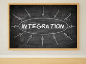 ręka, pisząc na tablicy szkolnej migracji i integracji