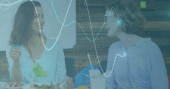 Biorąc pięciu przyjaciół pochylony i uśmiechnięty w barze, z selfie smartfona i nakładki danych. Socjalizacja, koleżeństwo, nowoczesny, technologia, wypoczynek, wnętrze, miejskie
