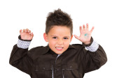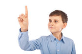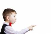 Ładny chłopczyk z pomysłem skierowana w górę, na białym tle nad białym