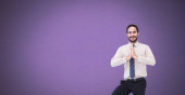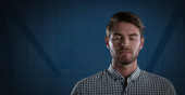 Rozważanie mężczyzny noszącego sweter, kołnierzyk, siedzącego na kanapie w salonie z efektami cząsteczek. Introspekcja, uważność, relaks, kreatywny, nowoczesny, ambient, przemyślany