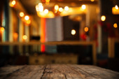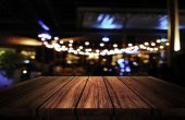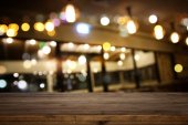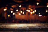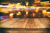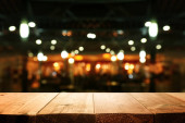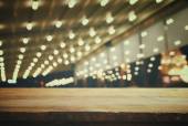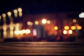 obraz drewnianego stołu przed abstrakcyjnym rozmytym tłem świateł odświeżających.