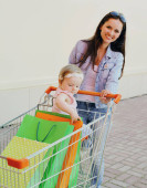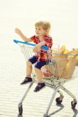 Szczęśliwy uśmiechający się dziecko siedzi w koszyku wózka z kolorowych jedy