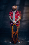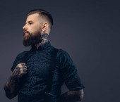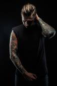 Zdjęcie "Człowiek z brodą i tatuaż trzymając głowę." może być wykorzystywane do celów osobistych i komercyjnych zgodnie z warunkami zakupionej licencji Royalty-free. Obraz jest dostępny do pobrania w jakości wysokiej rozdzielczości do 5760x3840.