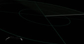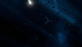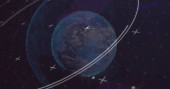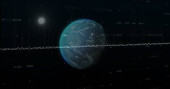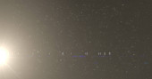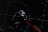 Pływające białe ikony awatara cofające się na niskim horyzoncie w ciemnej przestrzeni, z numerycznymi etykietami i rozbłyskiem. Wizualizacja, sieć, dane, punkty, głębia, blask, minimalistyczny