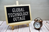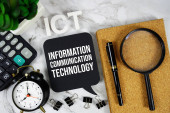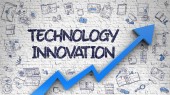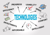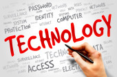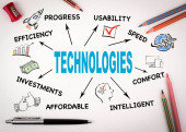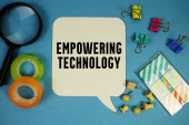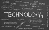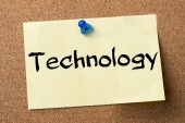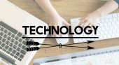 słowo "TECHNOLOGIA" na kartach z kolorowymi strzałkami skierowanymi ku niemu na niebieskim tle