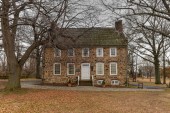 Widok głównego domu w John Dickinson Plantation pokazujący mieszankę stiuku i cegły bocznicy z jasnym jesiennym drzewem.