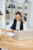 Młoda kobieta z rudymi włosami rozmawia przez telefon trzymając filiżankę kawy w eleganckim biurze.