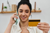 Radosna młoda kobieta z rudymi włosami wykonuje telefon podczas pracy w nowoczesnym biurze.