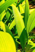 Świeże zielone liście banana tropikalnego w jasnym słońcu z miękkim tle Bokeh, bujne egzotyczne liści dla przyrody i koncepcji latem