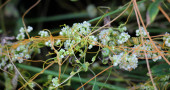 Pasożytniczy dodder polny (Cuscuta campestris) rośnie na polu wśród upraw