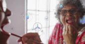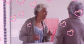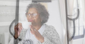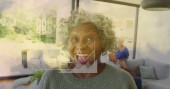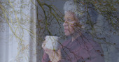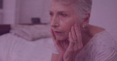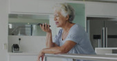 Starsza kobieta dotykająca podbródka, nosząca w paski top w kuchni, kolorowe litery nakładające się na siebie. Dojrzałe, kontemplacyjne, zadumane, miękkie, niebieskawe, otoczone, jadalnia