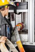 Szczęśliwy Firewoman z kolegami dyskusji przez ciężarówki