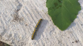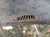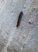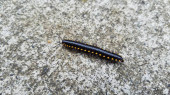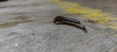 Dwa żółte stonogi kryjące się na powierzchni betonu, Fotografia dzikiej fauny i flory, Makro z gatunku Polydesmida