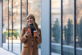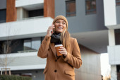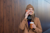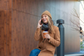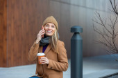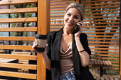 Uśmiechnięta przedsiębiorczyni rozmawiająca przez smartfona, delektująca się mrożoną latte matcha w kawiarni. Pojęcie pracy zdalnej, połączenia biznesowego i nowoczesnego miejskiego stylu życia zawodowego.