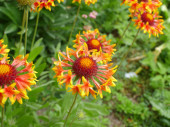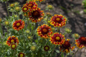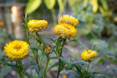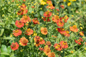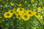 Jesień helenium kichające chabry w rozkwicie, kilka żółtych kwiatów kwitnących, wysokie krzewy