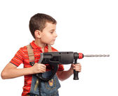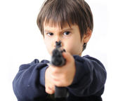 Azjatycki chłopiec celem fałszywych pistolet wykonany z skaner kodów kreskowych