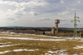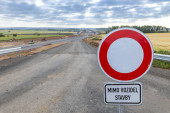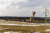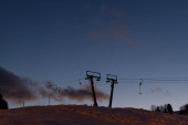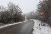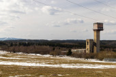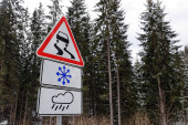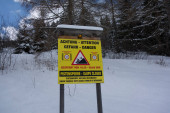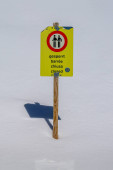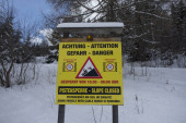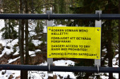 Znak ostrzegawczy Strefa graniczna. Wejście tylko za zgodą zamocowaną na drewnianym słupie w śnieżnym krajobrazie