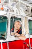 Uśmiechnięty mężczyzna strażak siedzi w Wóz Strażacki
