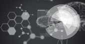 Wyświetlanie półprzezroczystego mózgu 3D w skali szarości w białej przestrzeni cyfrowej, z kolorowymi etykietami i węzłami. Dataviz, neural, network, graph, infografika, minimalistyczny, abstrakcyjny
