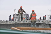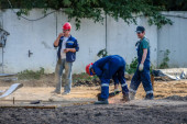 Ustawianie platformy montażowej na placu budowy. Z boku widać betonowe stosy już wbite w ziemię. Wysokiej jakości zdjęcie