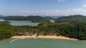Drone Widok z lotu ptaka na wyspę Banana, tropikalnej plaży z turkusową wodą, białym piaskiem i łodzi bangka w Coron, Palawan, Filipiny. Wysokiej jakości zdjęcie