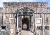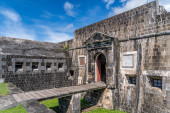 Róg z działami chroniącymi wejście do hiszpańskiego kolonialnego fortu San Lorenzo w Panamie koło Colon