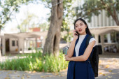 Azji młoda kobieta szczęśliwie mówi na smartfonie na zewnątrz Dorosła kobieta cieszy się rozmowy Komunikacja w środowisku miejskim jasny dzień