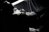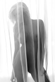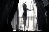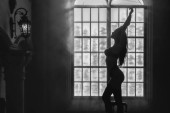 Black and white silhouette of beautiful young lady beside window