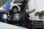 Młoda Afroamerykanka w kombinezonie fachowo zajmuje się konserwacją samochodów w garażu.