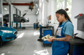 Zdjęcie "Młoda Afroamerykanka w kombinezonie fachowo zajmuje się konserwacją samochodów w garażu." może być wykorzystywane do celów osobistych i komercyjnych zgodnie z warunkami zakupionej licencji Royalty-free. Obraz jest dostępny do pobrania w jakości wysokiej rozdzielczości do 5760x3840.