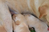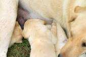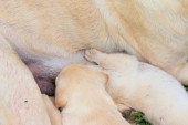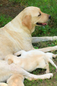 Mama i labrador szczenięta jeden miesiąc stary karmienia.