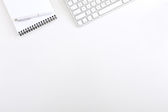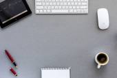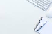 Biuro biały stół z komputera mysz i notatnik widok z góry