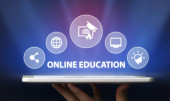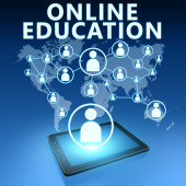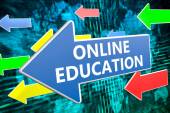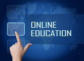 Online koncepcja edukacji z interfejs i świata mapę na niebieskim tle